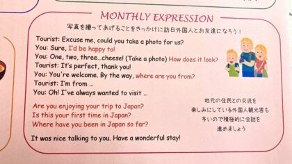 今月号では外国人に写真を撮って欲しいと頼まれた時の会話例をご紹介しています。